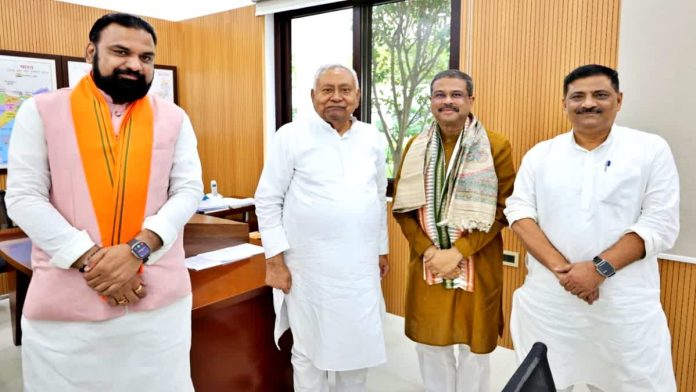 लाइव सिटीज, पटना: बिहार चुनाव 2025 को लेकर एनडीए में सीट बंटवारे पर अब सरगरमी बढ़ने लगी है. केंद्रीय गृह मंत्री अमित शाह ने नवरात्र के बाद एनडीए में सीट शेयरिंग एलान की घोषणा की है. हाल ही में केंद्रीय मंत्री धर्मेंद्र प्रधान को बिहार का चुनाव प्रभारी बनाया गया है. चुनाव प्रभारी बनने के बाद धर्मेंद्र प्रधान ने रविवार को मुख्यमंत्री नीतीश कुमार से मुलाकात की है. धर्मेंद्र प्रधान के साथ उपमुख्यमंत्री सम्राट चौधरी और जदयू के राष्ट्रीय कार्यकारी अध्यक्ष संजय झा भी मौजूद थे.